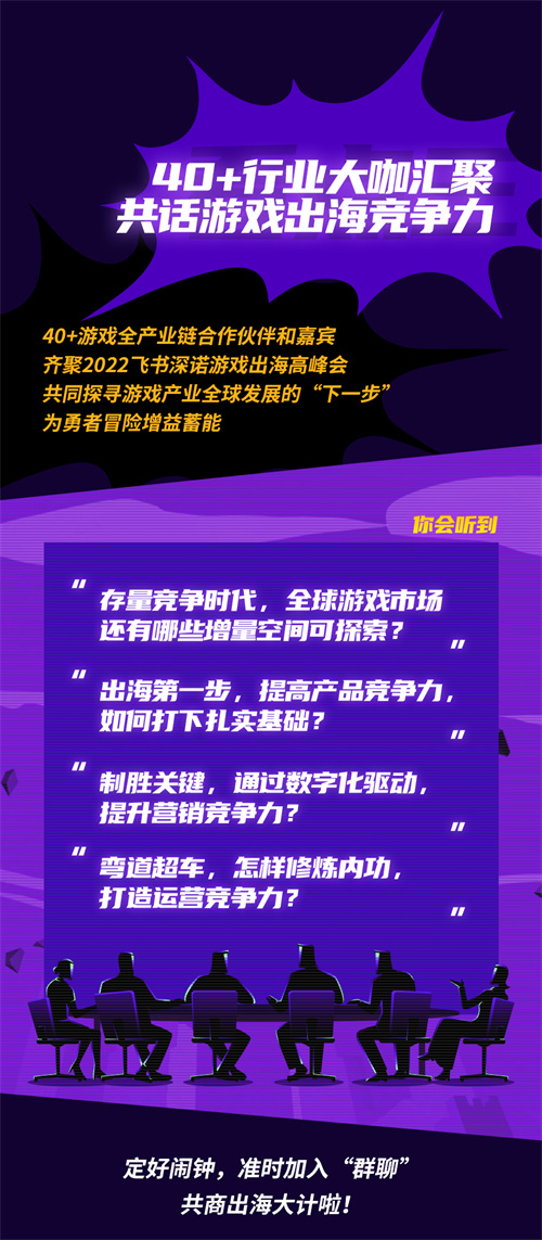 Meetgames是飞书深诺游戏事业部旗下专注于游戏出海的成长平台,致力于帮助国内处于出海早期的游戏企业打破出海壁垒、降低出海门槛、快速起步走向海外。平台以独创的出海竞争力评估模型为方法论和工具,对客户进行出海竞争力评估,通过提供出海指导、产品验证、服务器部署、投放推广、品牌营销、社区运营、运营本地化等服务,全面提升出海游戏企业的产品、营销、运营三大竞争力,满足游戏客户在筹备期、研发期、推广期、运营期不同阶段的需求。同时,基于多年技术沉淀和场景平台化服务经验,Meetgames平台推出自助广告营销服务,提供出海三大主流渠道Meta、Google、TikTok的在线自助开户充值&投放功能,便捷高效,轻松开启买量之旅。