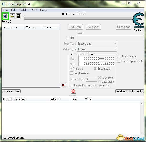 (注:下图是已经点击完First Scan的界面,所以看不到First Scan图标,但是位置就是2的位置)