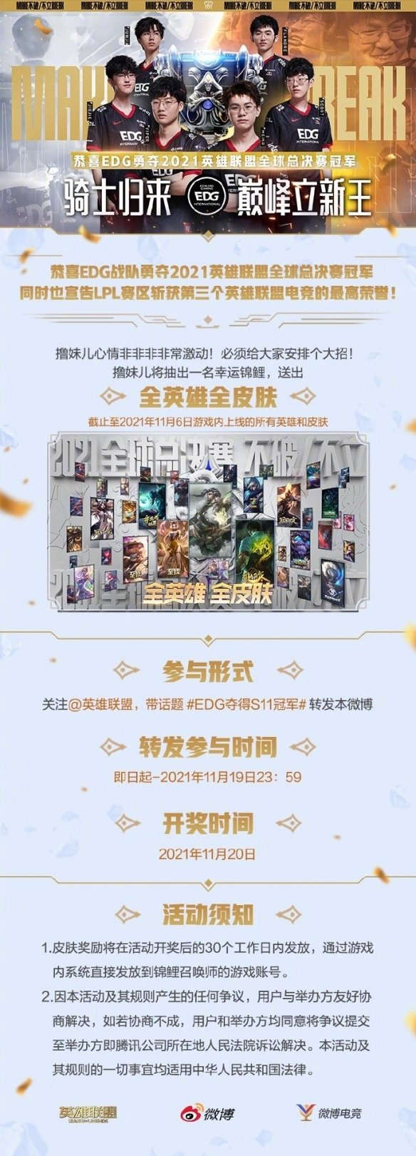 为庆祝《英雄联盟》EDG勇夺2021全球总决赛冠军,将于2021年11月12日开启商城在售商品全场半价、冠军精选限定皮肤限时销售,海克斯皮肤兑换半价等。