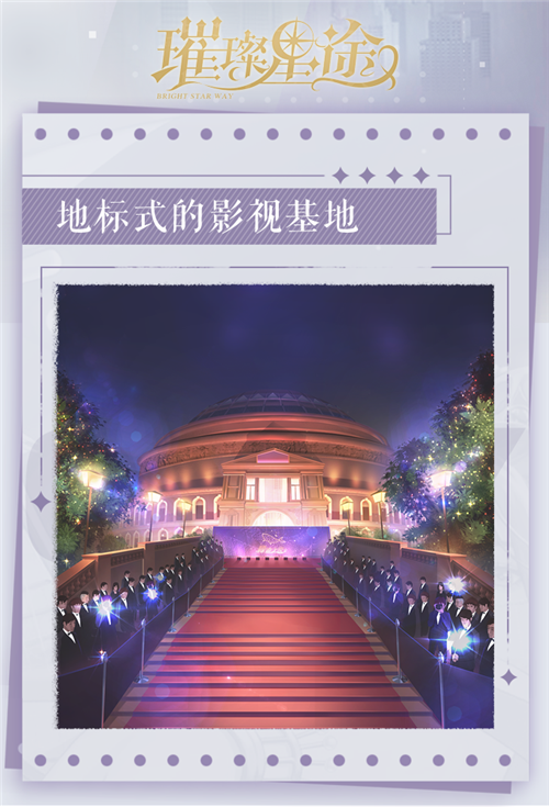 在自然景观和城市剪影外,千万别忘记了我们打工人们的老本行啊!既然要打造一个适合各位经纪人带着艺人追梦的超级都市,那么相关建筑一定不能少!摄像机穿梭下的影视基地、古风与现代交织的影城背景、红毯与灯光映照下的演唱会现场,这些都是各位经纪人们征战四方的“战场”,浓郁的娱乐圈氛围,就要在这些独特的场景中凸显!