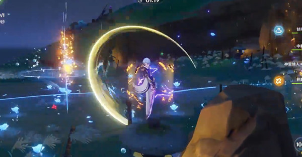 夜阑化作水影并迅速后退,对周围的敌人造成水元素范围伤害,并获得持续15秒的「夜雨听澜」,每当夜阑发射完成蓄力的箭矢时,会消耗「夜雨听澜」,并在命中的位置留下「夜雨」。「夜雨」会在持续时间内持续对范围内敌人造成水元素伤害,并使其范围内的当前场上角色基于夜榆的最大生命值,以一定比例获得最大生命值加成,多个「夜雨」提供的最大生命值加成不能叠加,效果与持续时间由后生效的为准。