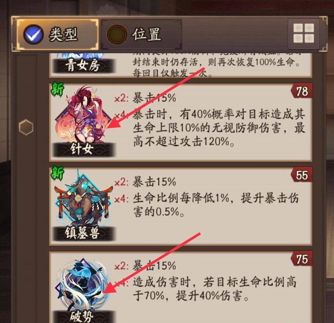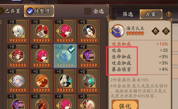 1、在御魂的选择方面,玩家需要先挑选一些值得强化的御魂,选择六星御魂,一般选择针女和破势来堆伤害。