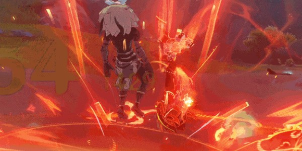 嘉明进入舞兽态势,为嘉明施加短暂的火元素附着,恢复一定的生命值,并召唤可靠的伙伴猊兽·文仔砸击目标,造成火元素范围伤害。