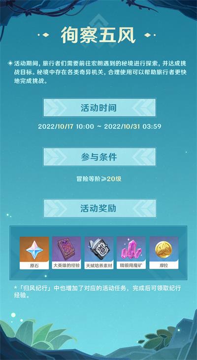 总的来说,原神徇察五风活动将在10月17日开启,对应的攻略可以参考文章图示以及内容提示哦。