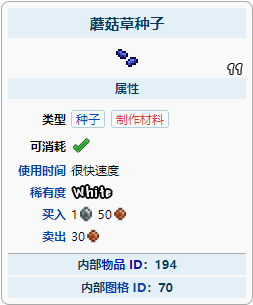 蘑菇草种子是一种在收获发光蘑菇时可能掉落的种子,可以用于种植你自己的发光蘑菇农场。当树妖居住在蘑菇生物群落中时,也会以每个1银币50铜币的价格出售这些种子。