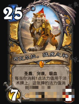 西瓦尔拉,猛虎之神是拉斯塔哈的大乱斗中加入的一张圣骑士 随从牌,在消耗完一定的法力值之后就可以在法力值消耗一点,这张牌可以收集。