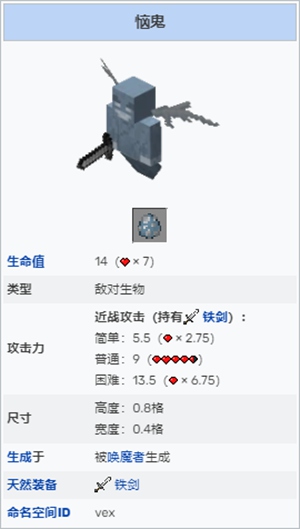 我的世界恼鬼。恼鬼是我的世界中的一种飞行生物,可以通过被唤魔者召唤从而生成。恼鬼也是我的世界中的一种较为特殊的敌对生物,它们能够穿越任意方块,并且手拿铁剑,因此伤害也不低,很多玩家们因此也是被恼鬼给困扰到。小编在这里为各位介绍一下恼鬼的一些信息,希望能够帮助到各位。