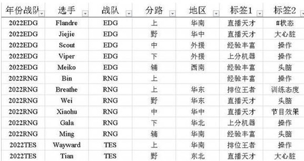 2:如图所示,对应的选手和标签一二小编都已经罗列出来了,你们可以进行参考,当然了,选手转会的时候是必得整卡的,所以这个我们可以利用一下,但是这个要看你们自己,反正下面的标签就是这样了,你们可以自行查阅。