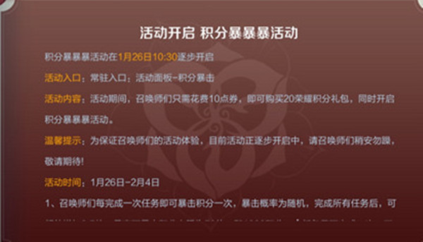 3:没有购买礼包的召唤师可以在完成任务之后,参与两次暴击,购买礼包才能领取已经暴击的积分;