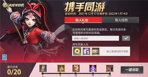 肆载同行,感恩一路相伴。2021年12月17日维护后~2022年1月14日活动期间,完成绑定并接受邀请码的大人,完成每日任务累计积分即可获得[回城咒印·燃奏乐潮]、[可可甜心、稚兔童心、闲游春野3选1礼包]等丰厚奖励!
