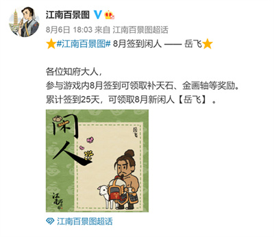 8月6日,江南百景图游戏官方在微博发出了一条有关8月新游戏人物-岳飞的介绍,文案中称其为“闲人”;