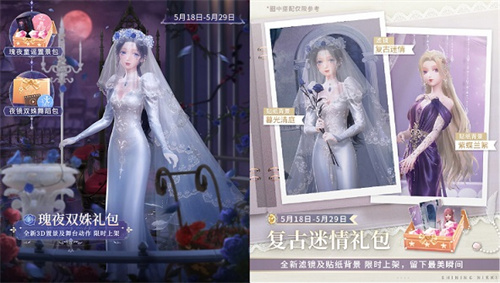 此外,5月18日至5月29日期间,“月吟花束”系列超值礼包在商城推荐-绯月之影页面限时上架,含氛围“绯红夜魇”、“银白月影”、粉钻及星钻礼包;夜镜双姝舞蹈包、瑰夜童谣置景包及复古迷情礼包限时上架:夜镜双姝舞蹈包含全新变装舞台动作“夜镜双姝”、粉钻等,瑰夜童谣置景包含3D可互动置景“瑰夜童谣”及静态置景“馥月花柱”“绯红之座”“谧月烛台”、粉钻等,复古迷情礼包含全新滤镜“复古迷情”、贴纸背景“紫蝶兰絮”“暮光清庭”及粉钻。超值特惠,限购1次,供有需要的玩家选购。