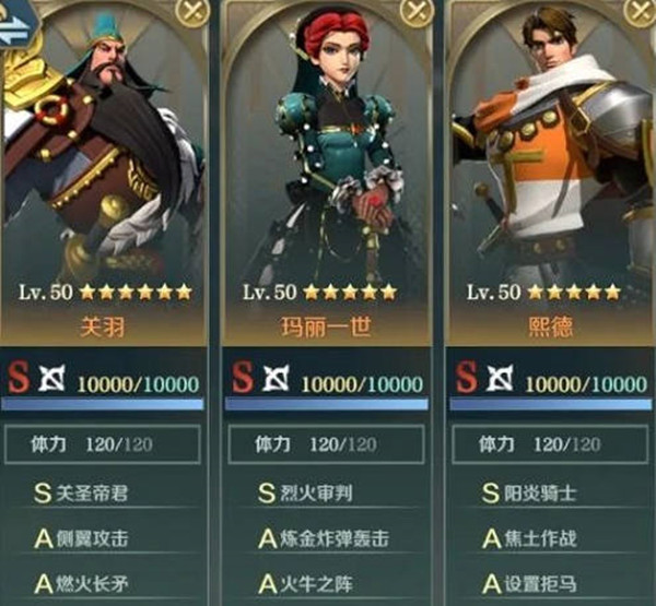 1:初期阶段灼烧队伍是游戏比较容易组合的开荒阵容,核心就是非常容易获得的关羽,和他进行搭配的是比较容易获得的玛丽一世还有熙德,熙德是初始可以选择的英雄之一,玛丽一世是在前期弯沉过任务之后就可以或得到;