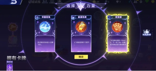 在幻域试炼中,车手们可抽取到不同技能的卡牌,包含飞机基础属性提升、飞行过程中增加道具等效果,大家可以结合自身情况与喜好,对多种卡牌进行搭配构筑~