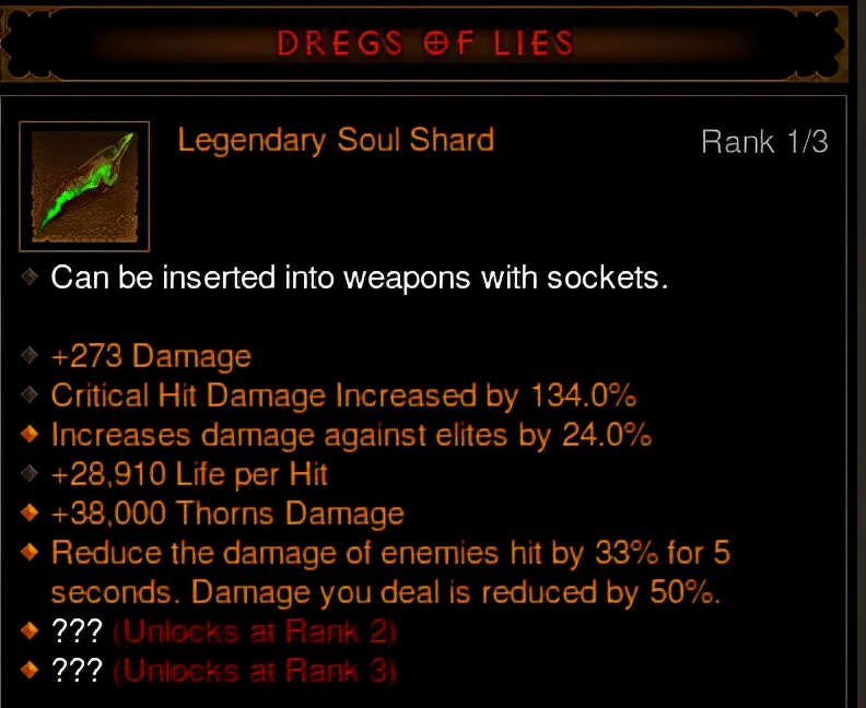 灵魂碎片共7枚,其中的恐惧碎片(对应迪亚波罗)、憎恨碎片(对应墨菲斯托)和毁灭碎片(对应巴尔)只能镶嵌于头盔,而罪恶濡染(对应阿兹莫丹)、苦难源泉(对应安达莉尔)、谎言残渣(对应彼列)和痛苦残渣(对应督瑞尔)只能镶嵌于武器。
