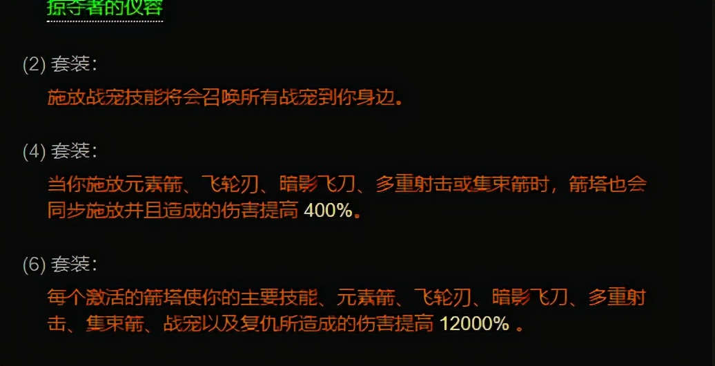 4件效果改为当你施放元素箭,飞轮刃,暗影飞刀,多重射击或集束箭时,箭塔也会同步施放。并且还会自动施放你所装备的憎恨消耗技能。