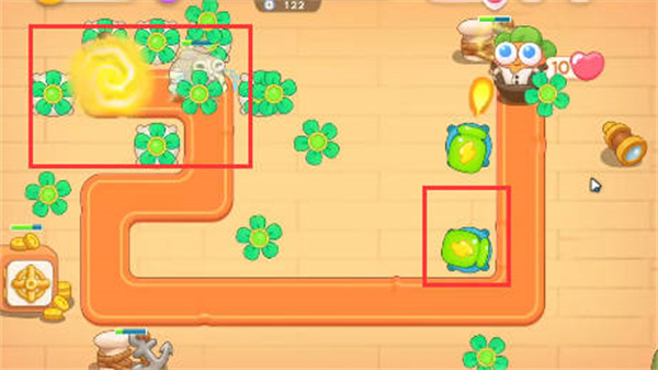 1:第一场我们选择风扇即可,然后我们在后排放置一个普通的炮塔,然后我们开局在出口的位置放置风扇清理怪物和障碍物,然后最后的样子如图所示;