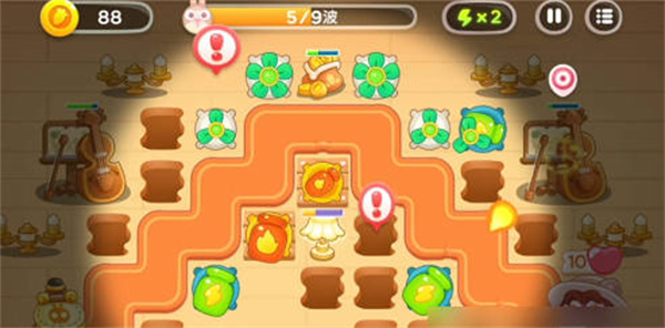 4:然后炮塔的话拐弯处可以建造火瓶子,其他外围随意,灯塔的话保持进度条在中间就好了,在第七波到第九波,后面出的滑板兔比较多,这个时候要注意我们的火力,可以留点钱补地板,剩下的钱就可以多多的建造炮塔。