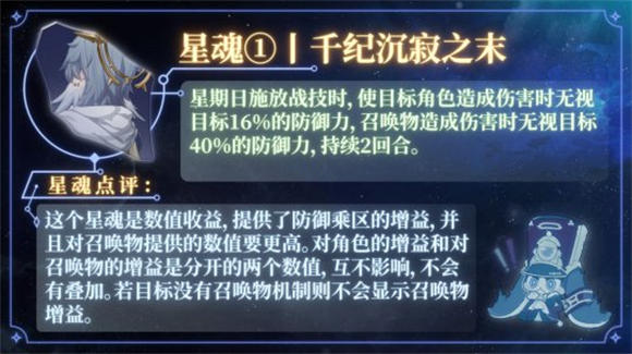 这个星魂能够提供数值上的增益,其中包括防御乘区增益,并且对于召唤物的数值提供更高的增益。该星魂对于角色本身以及召唤物的增益是分开计算的,二者互不影响,不会重复叠加。如果目标没有召唤物机制,则该星魂不会显示对召唤物的增益。