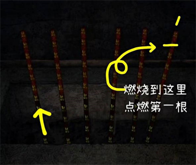 5:接着我们需要在右侧倒数第二根燃烧到白色线位置的时候再点燃左侧第三根,我们依次按照下图的操作进行就可以通关了。