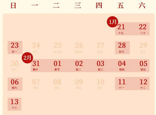 春节的安排是1月31日至2月6日,就是春节的假期,2月11日至13日;