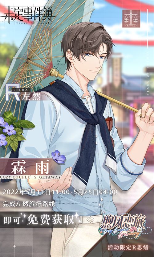 5月11日,「煦风恋旅·下篇」活动正式开启,全新活动SSR思绪、全新动态邀请函、甜蜜活动剧情、丰富限定奖励……与他携手,前往位于西南地区的旅游胜地昭南市,漫步山林,纵览湖景,开启属于你们的甜蜜旅行。