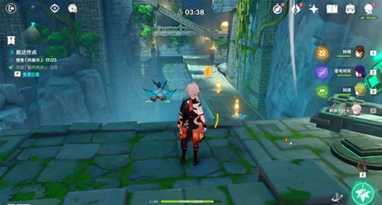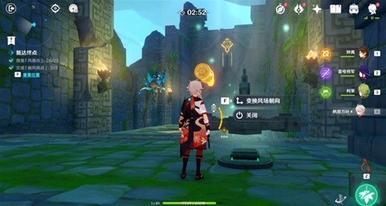 1.首先,我们进入秘境以后,先关闭图中右侧的机关,将风场关闭,随后将左边的拦风枢的风场方向调整为向上,随后往左走