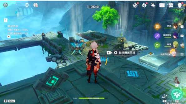 1、首先,我们进入秘境以后,先关闭图中右侧的机关,将风场关闭,随后将左边的拦风枢的风场方向调整为向上,随后往左走