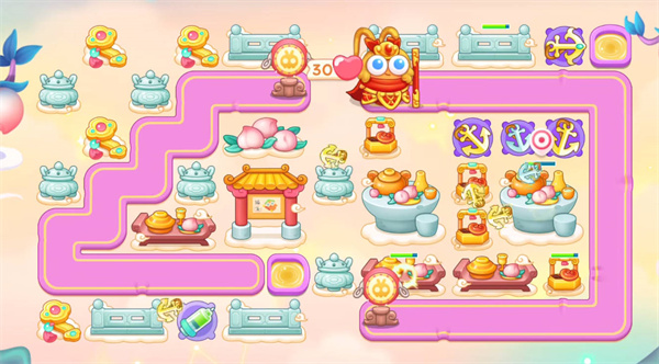5:然后就是按照我们这种进度,可以多放置几个船锚,优先升级靠近萝卜的道具,最后的画面就是船锚满天飞了,如图所示。