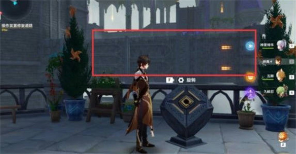 6:完成填补之后,我们原路回到方形装置这里启动 装置将塔再次旋转,将塔的长臂旋转到风场的位置,随后我们乘风而起,飞到上面,在上面我们发现了一个幽夜装置,调整装置将面前的柱子对其,完成填补,完成之后我们再跳回到前面的平台之上,顺着爬梯往上走,爬上来之后我们先往右手边方向走,清理了路上的丘丘人之后,我们继续往右手边方向走,在最里面的庭院这里找到我们的第三个宝箱;