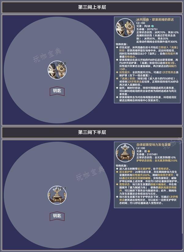 第一间全抗小幅提升且草元素抗性额外提升、第二间额外物理抗性提升;第三间敌人附带岩元素护甲,破除前全抗大幅提升;此外,下半所有敌人均免疫冻结、石化或有冻结抵抗。