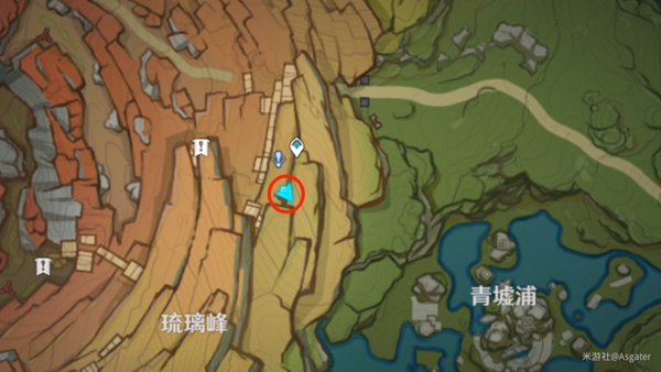 第6处老石位置推荐在拾取第5处老石之后按照图中的标记去获取,也可以从天工峡的东南方向通过跳台来到此处。