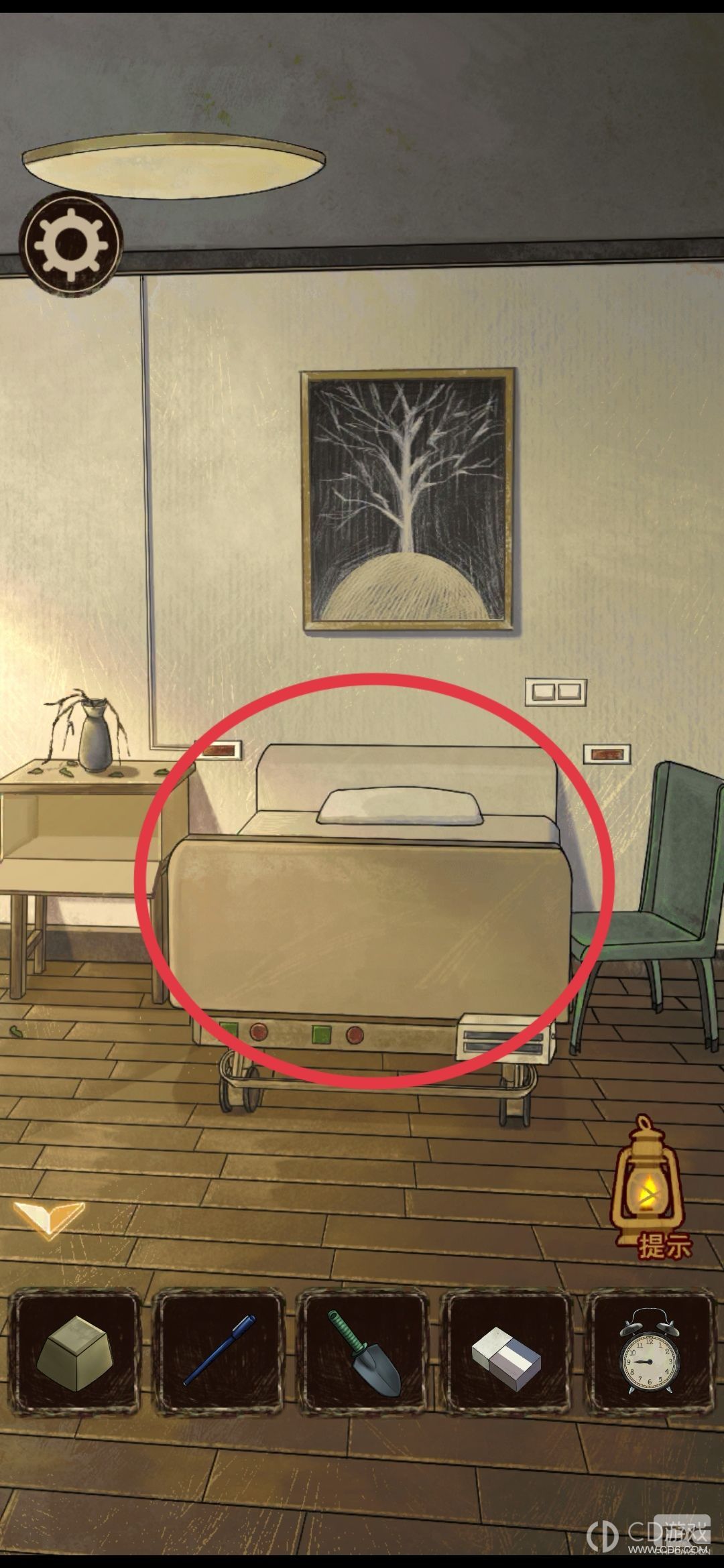 根据图案,解锁床头柜,拿到闹钟。