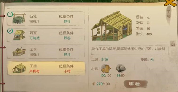 150繁荣值,每个建筑都可以提升繁荣值,提升最多的是“宗厅”建筑;另外每个村民也会提升5点繁荣值。前期可通过以下建筑组合轻松达到这个要求:茅草房*2,粗衣房,工台,石灶,宗厅。