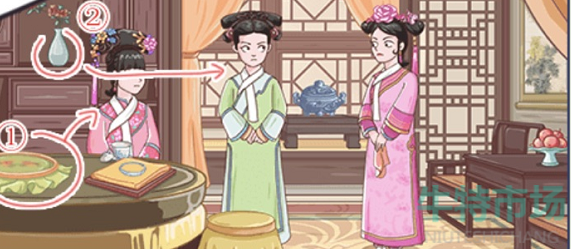2.然后通过与后面的花瓶向右互动可以获得一袋茶叶,把茶叶拖到中间的人,触发喝茶的动作;