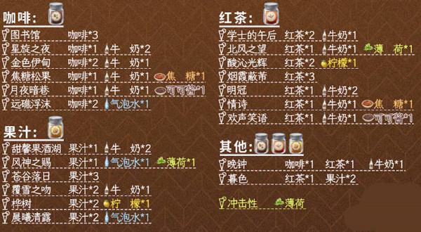 甜馨果酒湖,果汁一个,牛奶两个,风神之赐,果汁一个,气泡水一个,薄荷一个,苍谷落日,果汁三个,覆雪之吻,果汁两个,牛奶一个,华数,果汁两个,柠檬一个,晨曦清露,果汁两个,气泡水一个;