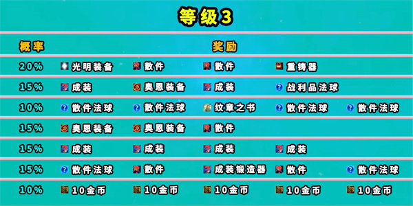 3:三级的时候散件,光明装备,奥恩装备,纹章书都是有概率出现的;