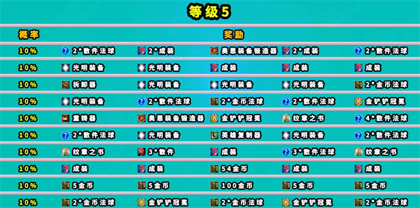 5:五级,散件,光明装备,拆卸器,重铸器,金铲铲冠冕,纹章书,金币,等等都是有可能的;