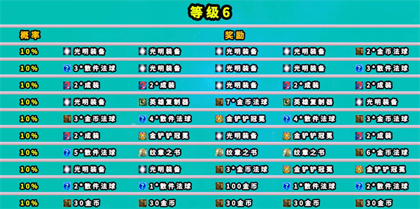 6:六级,在六级的时候会得到五级及之前所有的装备,注意这里是有概率,在六级会多出一个英雄复制器;