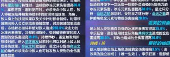 被动技能提供了非常丰富的增伤,如全伤害全元素伤害与物理伤害、无条件提高场上敌人受到来自自身的冰元素伤害以及宝贵的独立易伤等;