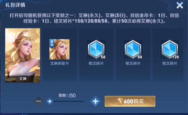 2、开启艾琳的圣光宝箱有一定概率获得永久艾琳,宝箱中还能开出铭文碎片、双倍经验卡等奖励;