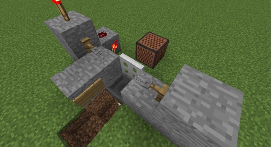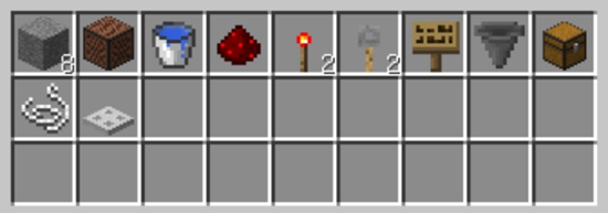 所需要的材料:8个石头(可替换能放红石的方块)、1个音符盒、1个水桶、1个红石、2个红石火把、2个绊线钩、1个告示牌、1个漏斗、1个箱子、1根线、1个铁活板门