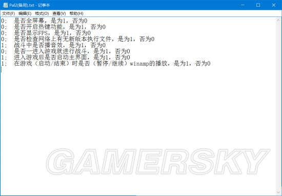 方法:在游戏根目录下新建一个“Pal2.txt”文本,复制如下字段至文本并保存(只输入前面的数字0、1也可实现功能,后面是注释),以后进入游戏时自动实现窗口化。