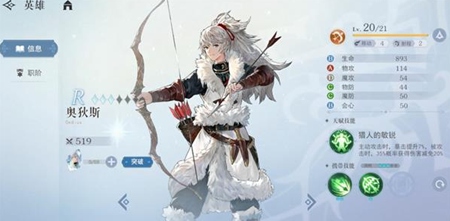 天赋-猎人的敏锐:主动攻击时,暴击提升5%,被攻击时,30%概率获得伤害减免20%效果。