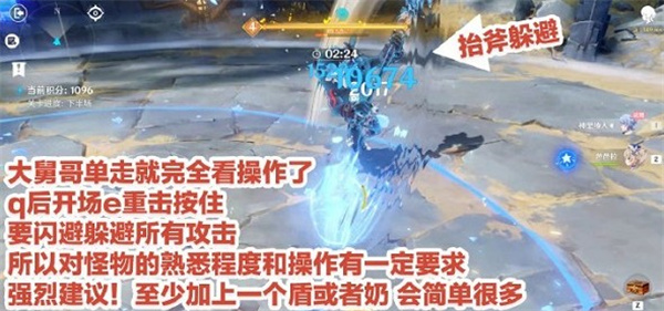 2:大舅哥单走q后开场e重击按住,要躲避所有的攻击,所以对怪物的熟悉程度和操作有一定的要求,比较建议带上一个盾或者奶妈,这样我们通关起来可能比较容易一些,反正大家仔细观看一下上图的各种注意事项就可以通关了。