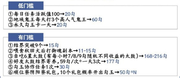 3:下面是中低练度的玩家每周勾玉情况,每日任务,地域鬼王,地域鬼王每周分享,永久勾玉卡,结界突破,寄养太鼓,勾协,百鬼奕三胜,协同对弈,秘闻,斗技,大概保底一个星期一千勾玉以上;