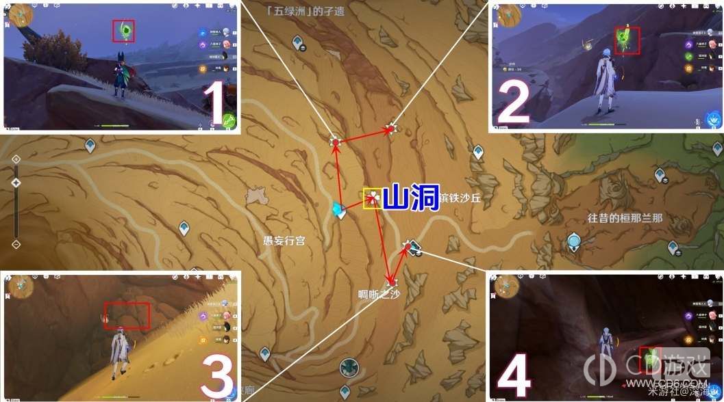1.一共四个镔铁沙丘草神瞳。它们的分布位置请参考下图: