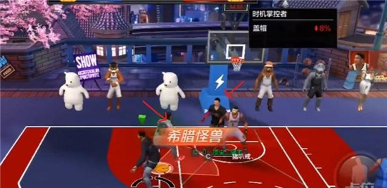 中锋换防意思就是我方中锋一直蹲守在三秒区,当希腊怪兽触发的字体出现时,中锋可以直接起跳将其盖帽。