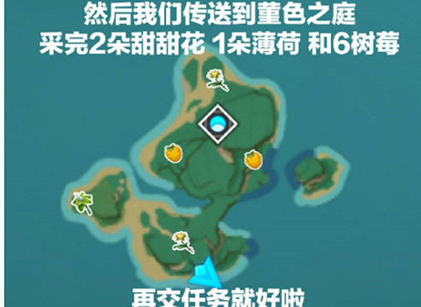 2:接着我们传送到堇色之庭,采集两个甜甜花,一个薄荷,六个树莓,然后我们再去提交任务;