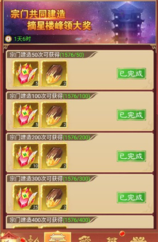 2、摘星楼需要宗门共同建造,建造的楼层分为普通楼层和黄金楼层,建造10层必出黄金屋,不同楼层对应不同的奖池奖励。